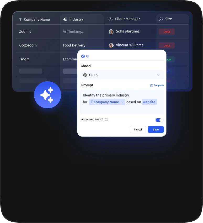 Turn any field into a smart, self-updating AI column. Write a prompt once — AI keeps your data fresh in real time or on your schedule.